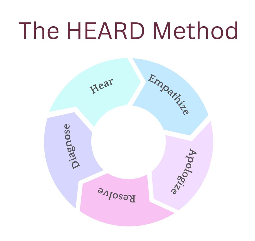 - Follow the HEARD Method – Hear, Empathize, Apologize, Resolve, Diagnose.