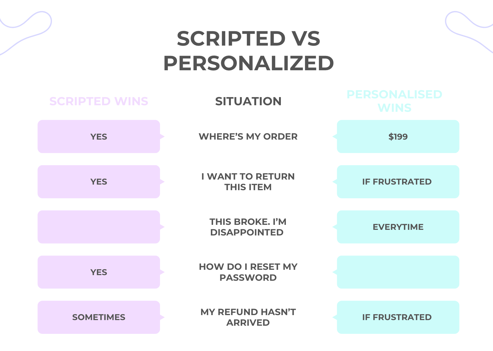 Comparison table showing when scripted vs personalized customer support performs better across scenariosPro tip: The best support agents don’t choose one approach, they switch gears based on the customer’s tone and issue.